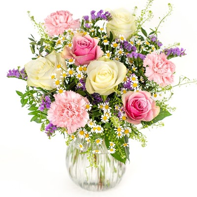 Sød buket med lyserøde roser, lyserøde nelliker, hvide roser, blå statice, camille-tanacetum, pistacie og thlapsi. Perfekt til fødselsdage, særlige øjeblikke og andre stunder, der er værd at fejre. Buketten er et eksklusivt floristhåndværk, og blomsterne er nøje udvalgt for at sikre høj kvalitet. Hver buket er unik og bindes ud fra det aktuelle sortiment og sæson – men bevarer altid sin farve og form. Buketten leveres af en lokal florist.