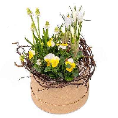 Lad vores kreative florister designe en smuk forårsbeplantning i en sød æske. Med sine hvide og gule nuancer er den det oplagte valg til alt, du vil fejre i foråret. Bestil til en, du holder af, eller køb en til dig selv og sæt den på bordet til påske. Floristhåndværk, når det er bedst. Hver beplantning er unik og sammensættes ud fra sortiment og sæson – men bevarer altid sin farve og form. Blomsterne er håndplukkede for at sikre høj kvalitet. Forårsbeplantningen leveres af din lokale florist.