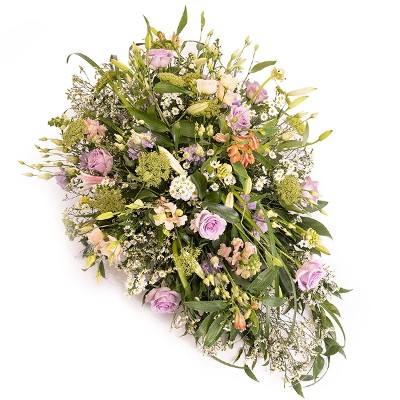 Denne delikate båredekoration indeholder en harmonisk blanding af pastel farver accentueret med dekorative grønne blade. De bløde pastel toner fremkalder kærlighed og erindring, hvilket gør den til et trøstende og elegant valg til en begravelse. Den frodige grønne tilføjer dybde og naturlig skønhed til opstillingen. Denne smukt udformede buket tilbyder enestående værdi og sikrer en hjertelig og overkommelig hyldest til at ære din elskede.