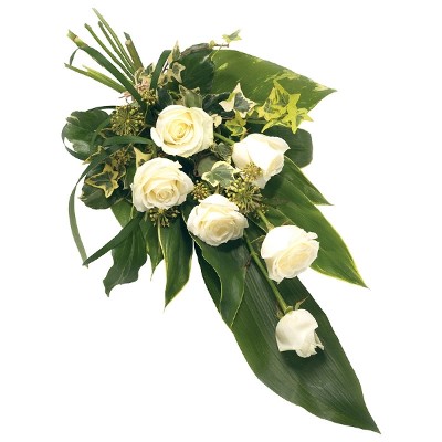 Denne klassiske sørgebuket indeholder den tidløse skønhed af hvide roser, suppleret med sæsonens grønne blade. De rene hvide roser symboliserer renhed og fred, hvilket skaber en rolig og respektfuld opstilling til en begravelse. Den frodige grønne tilføjer dybde og et strejf af naturlig elegance. Denne smukt udformede buket tilbyder fremragende værdi og sikrer en hjertelig og overkommelig hyldest til at ære din elskede.