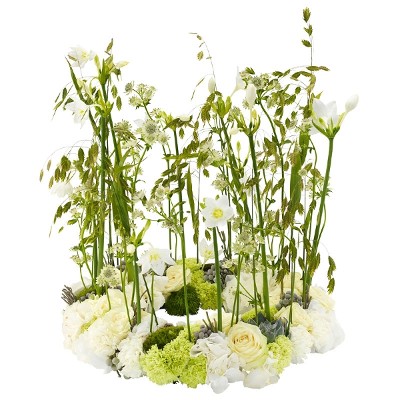 Du vil altid være i vores hjerter. Send din personlige hilsen med denne smukke krans. Den vil typisk indeholde blomster som roser, nelliker, hortensia og dekorativt grønt.